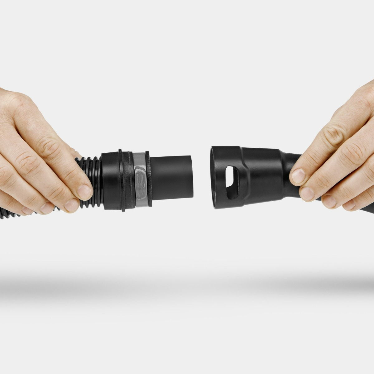- The suction hose can be stored in a space-saving manner by hanging it on the device head.